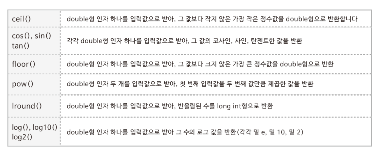 math.h : 수학 관련 함수, 대부분의 수학 관련 함수는 double형의 인자를 갖고, double형의 값을 리턴합니다.