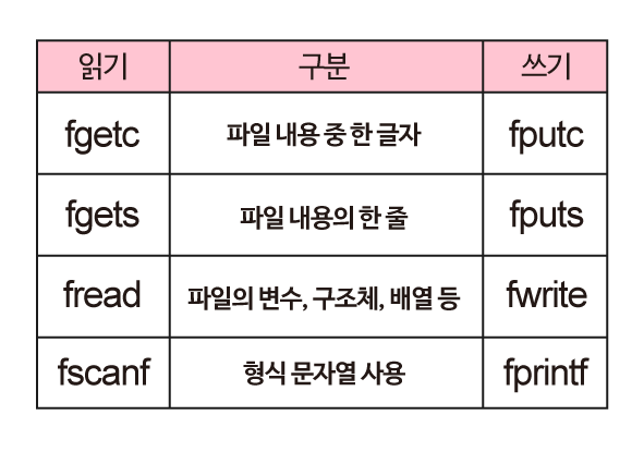 C의 표준 입출력 라이브러리인 stdio.h에서 파일을 읽고 쓰는 기능을 제공합니다. 먼저 파일에 접근해야 파일의 데이터를 읽어오거나 쓸 수 있습니다. 파일은 FILE이라고 하는 구조체로 구현되어 있습니다. 따라서 <코드 1>의 1행과 같이 FILE* file; 코드를 이용해 변수를 선언할 수 있습니다.
