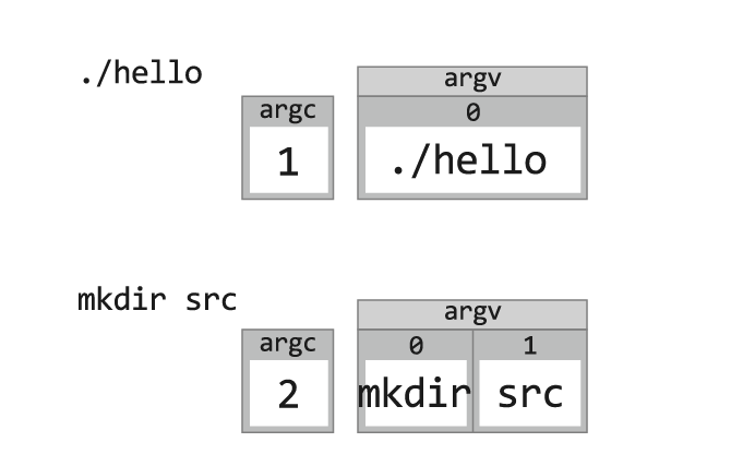 /hello와 같이 프로그램을 인자 없이 실행시킬 때 argc와 argv를 살펴보면, 프로그램을 호출하는 것만이 유일한 인자이기 때문에 argc는 1이 됩니다. 반면, argv는 인덱스 0에 문자열 ./hello를 원소 하나만 갖고 있는 배열이 될 것입니다.