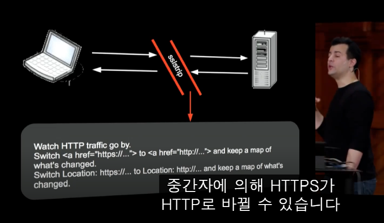 해커는 웹 서버와 사용자 사이 DNS 서버와 라우터 등으로 악성 코드를 보내 https://를 http://로 바꿀 수 있습니다. 그 결과 사용자가 봤을 때는 정상적인 사이트이지만 실제로는 그렇지 않은 사이트로 변경됩니다. 이러한 방법을 중간자 공격이라고 합니다.
