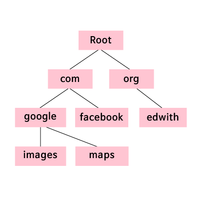 - DNS에서 관리하는 도메인은 트리 형태의 계층 구조로 이루어져 있습니다. 기본 최상위 도메인(TLD) 집합이 있는데, TLD는 여러분들이 익숙한 웹 사이트 주소 마지막 부분입니다(com, net, org, edu 등). 웹 사이트 URL들은 이러한 최상위 도메인들 중 하나로부터 가지를 뻗어나갑니다. 예를 들어 “google.com”은 최상위 도메인 “com”에서부터 가지를 뻗어나갑니다. 더 멀리 뻗어나가는 가지들을 서브 도메인이라 합니다. “image.google.com”과 “maps.google.com”이 예입니다.
