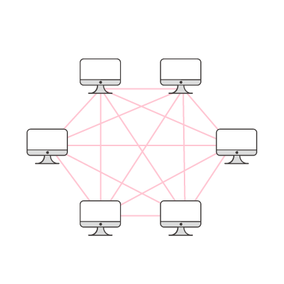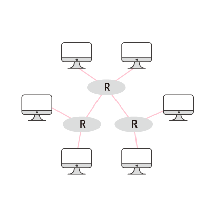 - 인터넷은 네트워크상의 모든 컴퓨터를 물리적으로 연결하는 대신 라우터를 씁니다. 라우터는 인터넷상의 장치들 사이에서 중재자 역할을 합니다. 모든 컴퓨터는 <그림 2>처럼 어떤 라우터 하나와 연결되어 있고, 각 라우터는 다른 라우터들과 연결되어 있습니다. 그렇기 때문에, 컴퓨터는 하나 이상의 라우터를 거쳐 데이터를 인터넷상의 다른 컴퓨터로 보낼 수 있습니다.