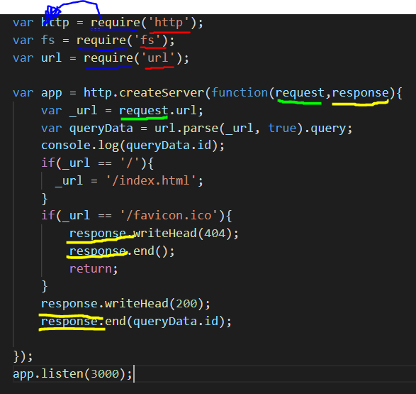 각 변수에 묘듈을 요구해(require) 얻은 값을 대입함.
