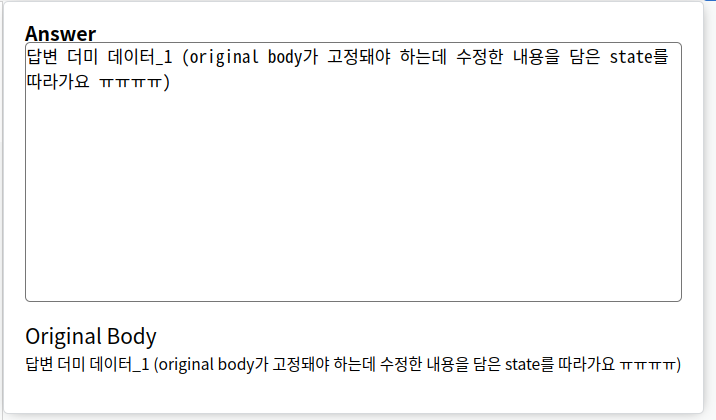 - 구현하려던 것 : 위에 있는 input (textarea) 창에서는 자유롭게 수정을 하고, 밑에 있는 Original Body 부분에서는 기존 글 내용이 보여져야 한다.