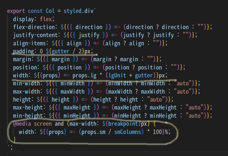 영상을 보다 보니 container > row > col 시스템이 있기는 하지만 내가 원하는 칼럼 그리드 시스템이 아니었다. 나는 칼럼 수에 따라 정해진 width값 사용을 원하는 것이어서, styled-component에서 칼럼 그리드 사용하는 방식을 다시 검색해 봤다.