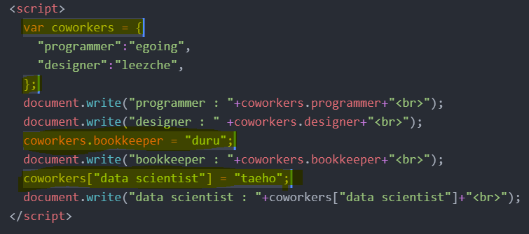 * coworkers["추가할 내용"] 추가할 내용이 띄어쓰기를 포함한 경우, 배열에 쓰던 것처럼 ["__"]를 이용해서 원하는 값을 넣어 줌.