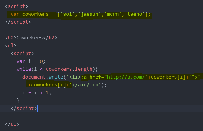 *배열 안에 있는 값의 개수를 출력하고 싶다면 document.write(coworkers.length);
